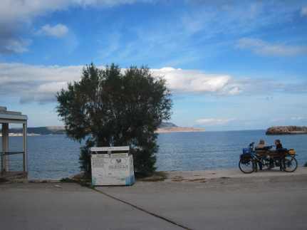 |  | We drove to Rethymno, collected Maria from her apartment and then parked near the harbour in a car park. We walked to a nearby Café to have a drink. A man arrived on a bicycle with a dog in a box. According to Maria, he comes here every day and has a drink with his mates while his dog runs loose. |
