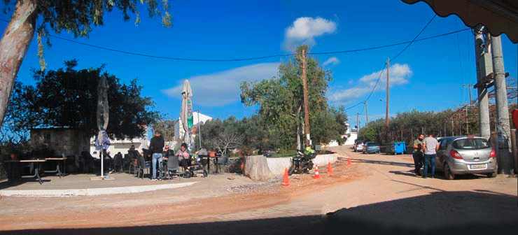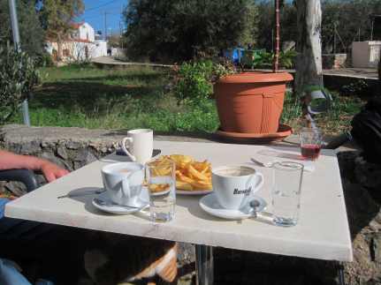|  At lunchtime I rode to Café O Petros to sit with Billy, Chris and DD for an hour. DD confirmed that his son will have his leg removed tomorrow. |