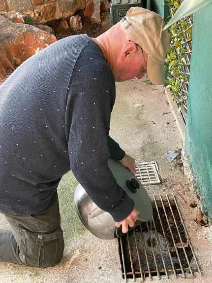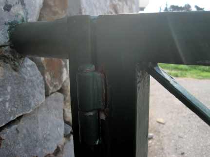 |  | Mario ground off the rust, oiled and freed off the hinge so that it moved and then welded it back in place. Chris paid Mario forty Euros and he left. I instructed Chris to get primer on the hinge right away, then the top coat, and to keep it oiled in future. |