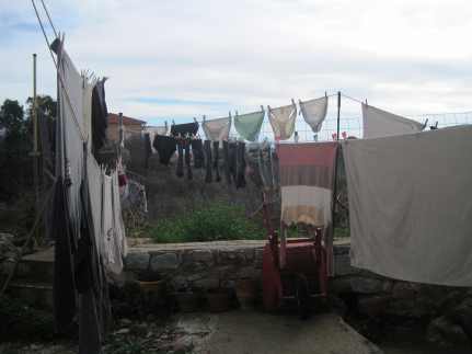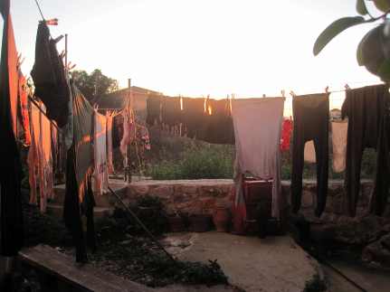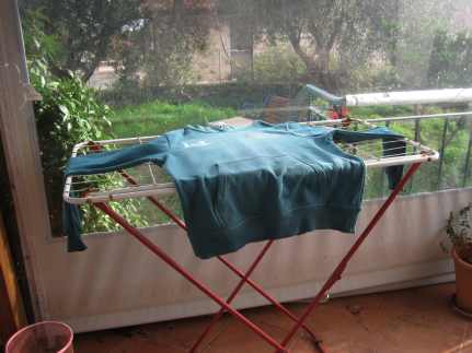 |  | I arrived home as Iliana was leaving. She'd brought in the washed clothes, apart from her hoodie, which was still soaking wet. As the sun disappeared behind the hill, I brought the hoodie indoors, hung it in the pergola and directed a fan at it. |