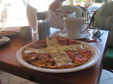 |  | We drove to Georgioupoli for breakfast at Dimitris' "Splendid" Café. Feeling replete, we staggered to the butcher's shop to buy eggs and cheese. |