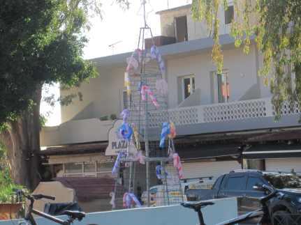 |  | The "Christmas tree" was still there. It's constructed from decorated "pool noodles" on a wire frame with lots of LED light strings, which look lovely in the dark. I phoned Chris to let him know what was happening. He told me that his electric stand-me-up square had just been delivered and the technician had told him that his wall socket was dangerous so he was going to Vrises to buy a new one. I told him that I'd meet him at the cafe and afterwards I'd follow him home to install the new socket. |
